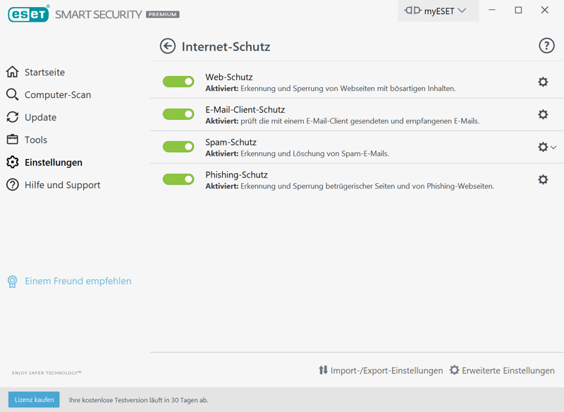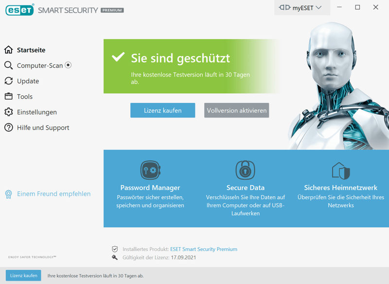 Sie können ESET Smart Security Premium 30 Tage lang kostenlos testen – ohne die Angabe von Zahlungsdaten. Zudem gibt es eine 30-tägige Geld-zurück-Garantie.
