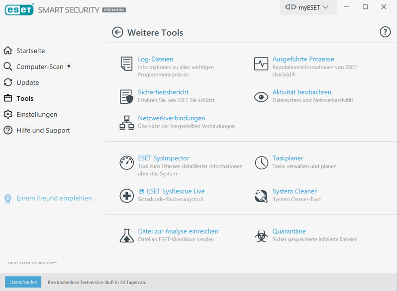 Im Tools-Bereich finden Sie alle wichtigen Funktionen von ESET