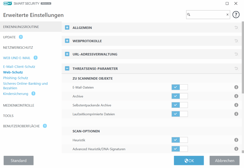 E-Mail- und Web-Schutz sind ebenfalls fester Bestandteil aller Windows-ESET-Versionen. Auch hier können Sie allerlei zusätzliche Konfigurationen vornehmen und beispielsweise festlegen, welche Objekte gescannt werden sollen, und die Säuberungsstufe bestimmen.