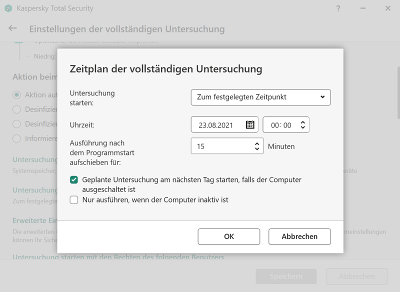 Im Untersuchungszeitplan können Sie Scans in gewissen Zeitabständen vorausplanen oder auswählen, nach welchen Aktionen eine Untersuchung stattfinden soll. Insgesamt ist die Konfigurierbarkeit bei Kaspersky noch höher als bei vielen anderen Antivirus-Programmen.