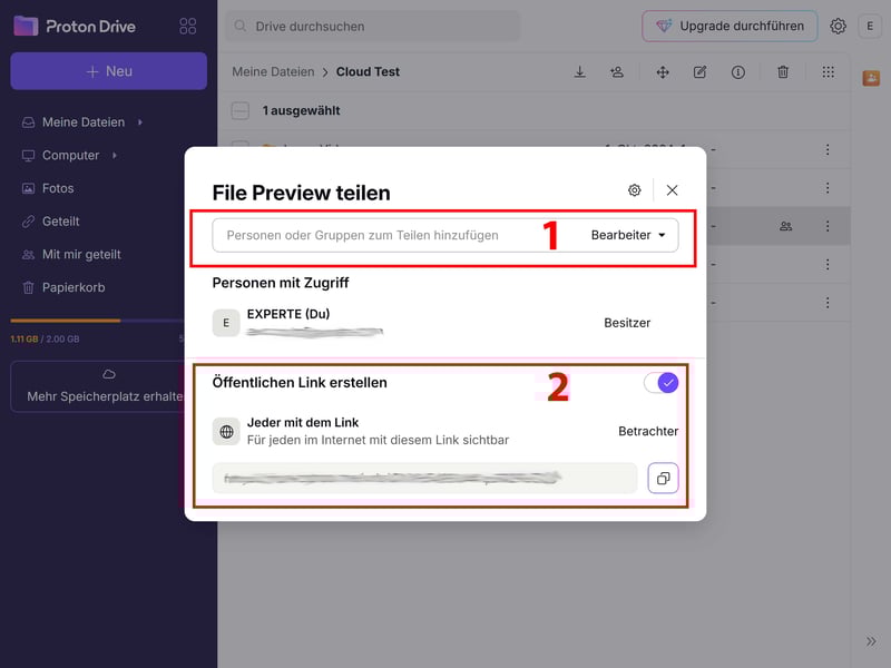 Sie können Leute gezielt zur Cloud-Ressource einladen (1) oder Freigabelinks teilen (2).