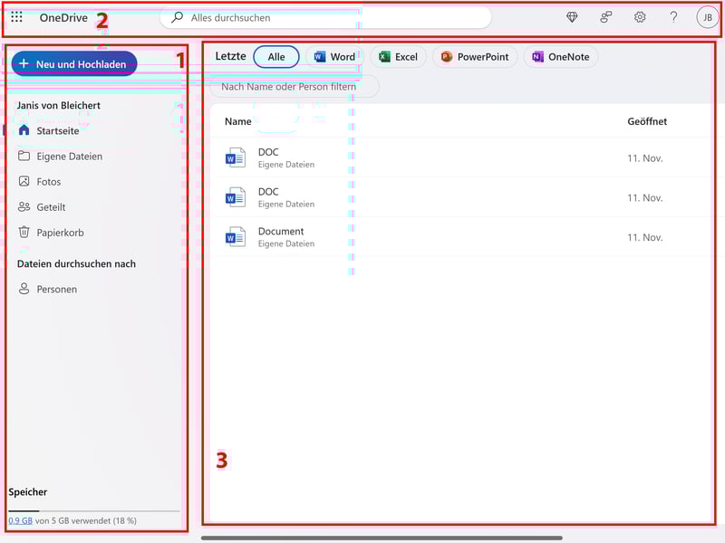 Linke Seitenleiste: Hier navigieren Sie zwischen verschiedenen Bereichen Ihres OneDrives. Über den blauen Button oben links können Sie direkt neue Dokumente und Ordner anlegen oder hochladen.