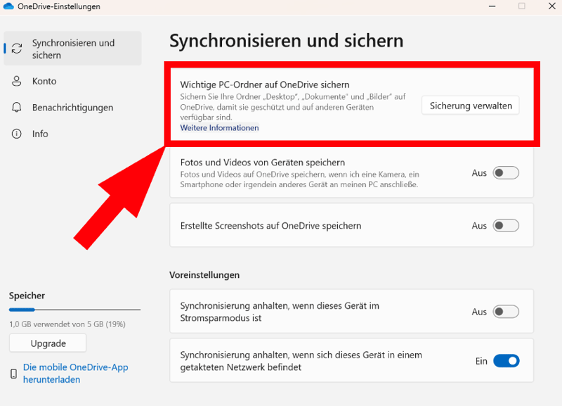 Leider ist Microsoft hier etwas unflexibel: Sie können den Dateipfad nicht manuell angeben, wie etwa bei Google Drive, sondern nur ausgewählte Ordner sichern, und zwar: