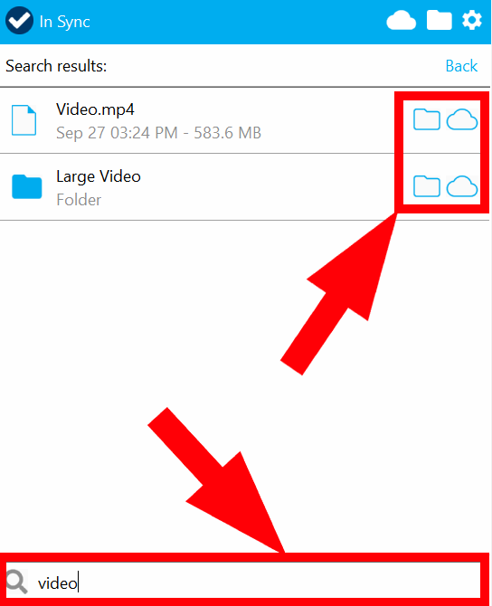 Über die Oberfläche der App, die Sie (bei Windows) mit einem Klick auf das Icon im System Tray unten rechts in der Taskleiste öffnen können, greifen Sie also nicht direkt auf Dateien zu. Sie können nach Dateien suchen, werden aber zur Web-App (Wolken-Symbol) oder dem Dateimanager (Ordner-Symbol) weitergeleitet, um sie zu öffnen.