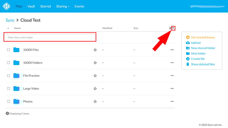 Die Suchfunktion von Sync.com durchsucht leider nur den aktuell ausgewählten Ordner.