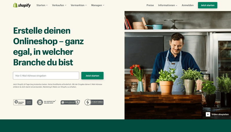 Schön ist, dass Sie Shopify 14 Tage lang kostenlos testen können. Zahlungsdaten müssen Sie dabei nicht bei der Anmeldung angeben, sondern erst, wenn Sie Bestellungen entgegennehmen und verfolgen möchten. Auch dann können Sie aber selbstverständlich vom Abonnement zurücktreten, ehe die erste Zahlung fällig wird.