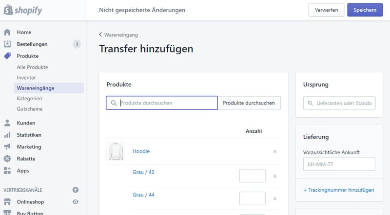 Ihren Lagerbestand verwalten Sie im Bereich Inventar. Hier können Sie die verfügbare Menge Ihrer Produkte manuell festlegen und neue Mengen hinzufügen. Unter Wareneingänge lassen sich eingehende Bestellungen verfolgen und erfassen. So sehen Sie die Anzahl eingehender Artikel und das voraussichtliche Lieferdatum direkt in den Produktdetails, und das Inventar wird nach Eingang automatisch aktualisiert.