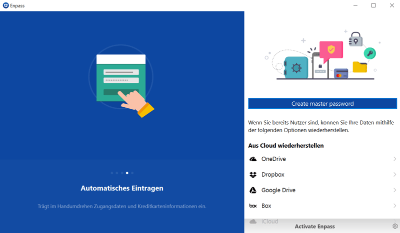 Während die meisten Passwort-Manager auf eingebundene Cloud-Funktionalität setzen, sind Cloud-Features bei Enpass optional. Mit bekannten Anbietern wie Dropbox, Google Drive oder OneDrive können Sie Ihre Daten bei Bedarf synchronisieren. In der Voreinstellung werden Daten nur lokal gesichert, was das Programm für manche Nutzer besonders interessant machen könnte. Praktischer wäre jedoch eine reguläre Cloud-Synchronisierung.