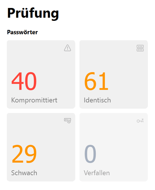 Ein ausgeklügeltes Sicherheits-Center wie andere Passwort-Manager hat Enpass nicht, doch im Untermenü „Prüfung“ können Sie immerhin sehen, welche Ihrer Passwörter den Standards des Programms nicht gerecht werden und welche Sie wiederholt verwendet haben.