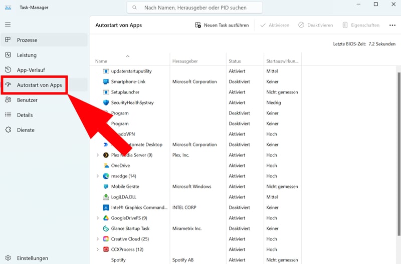 Schritt 2: Wechseln Sie im Navigationsmenü zum Reiter „Autostart“. Hier sind die Programme, die beim Hochfahren automatisch gestartet werden, aufgelistet.