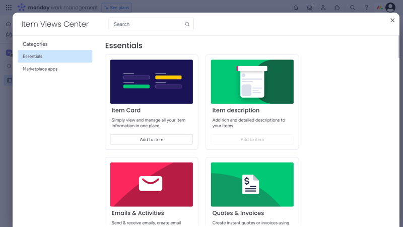 monday.com bietet verschiedene Produkte an, die Sie wie einzelne Module aktivieren oder deaktivieren können. Zu Beginn ist das Produkt Work Management aktiv, das die wichtigsten Projektmanagement-Funktionen umfasst.