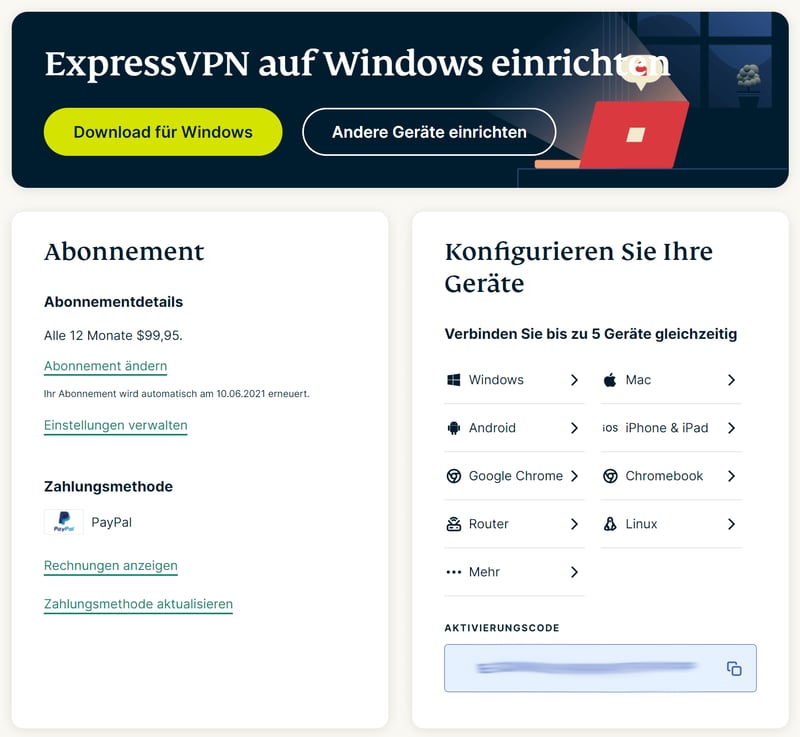 Wenn Sie sich bei ExpressVPN registrieren, erhalten Sie im Dashboard einen Aktivierungscode zugeteilt, mit dem Sie sich auf den verschiedenen Geräten anmelden können. So vermeidet das Programm, dass Sie bei jeder Registrierung eines neuen Gerätes Passwort und Benutzernamen erneut eingeben müssen. Jene sind nur für den Browser-Login erforderlich. Zudem müssen Sie Ihre E-Mail-Adresse nicht zwingend verifizieren, falls Sie auf diesen zusätzlichen Faktor der Anonymität wert legen.