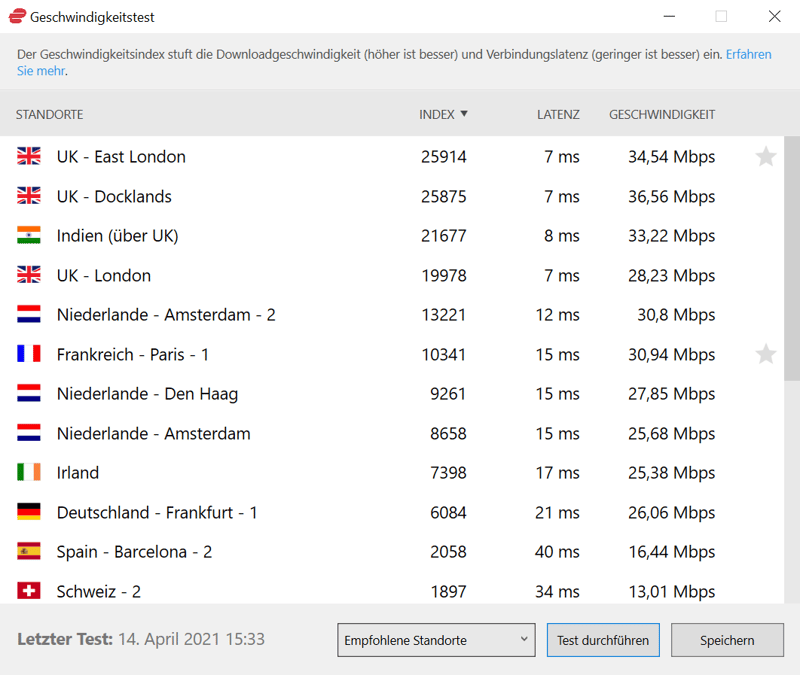 Zum Test-Zeitpunkt schrammte ExpressVPN gerade so am Siegertreppchen vorbei und erreichte mit einem Download von 175,0 Mbit/s und einem Upload von 42,0 Mbit/s den 4. Platz in unserem Ranking.