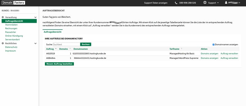 In der Auftragsübersicht finden Sie Ihre DomainFactory-Tarife aufgelistet.