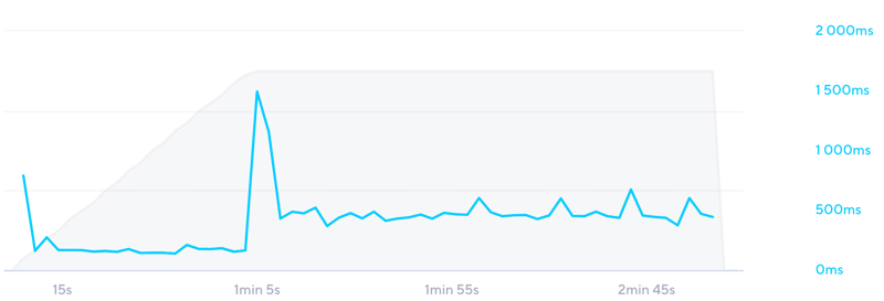 Ohne Cache kann es jedoch sein, dass ein überlasteter Server für längere Antwortzeiten sorgt. Glücklicherweise nicht bei DomainFactory: Trotz einer kurzen Spitze blieb die Performance auch unter Last konstant. Die folgende Grafik zeigt die Entwicklung der Antwortzeit (blaue Linie) bei wachsenden Besucherzahlen (graue Fläche):
