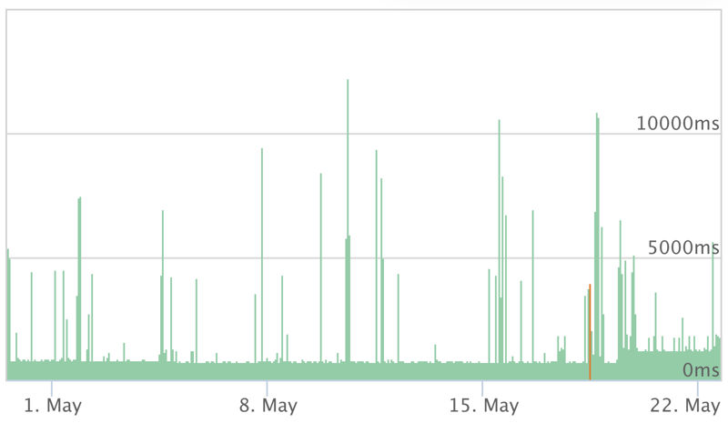 Wir haben die Time to First Byte sechs Wochen lang mit deaktiviertem Cache getestet. Dadurch erhielten wir nicht nur einen Durchschnittswert, sondern auch einen Eindruck der Schwankungen im Zeitverlauf. Jene sind bei DomainFactory nicht allzu stark ausgeprägt, wie Sie an der folgenden Grafik erkennen. Sie zeigt die jeweils schlechteste Antwortzeit pro Stunde im gesamten, sechswöchigen Testzeitraum: