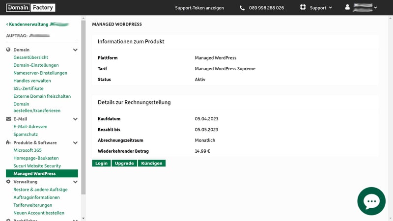 Klicken Sie rechts beim richtigen Eintrag auf „Auftrag verwalten“, um die Detailansicht Ihres Managed WordPress Hosting-Pakets zu öffnen.