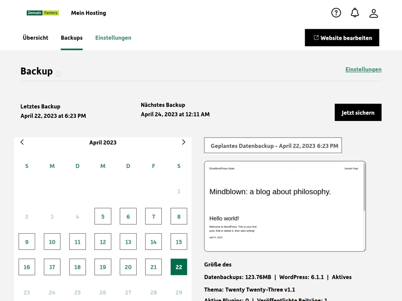 Jedes automatische Backup steht 30 Tage lang zur Verfügung. Sie finden es im WordPress-Kundenbereich im Backup-Tab, wo Sie es mit einem Klick wiederherstellen können. Manuelle Backups können Sie in diesem Menü ebenfalls vornehmen.
