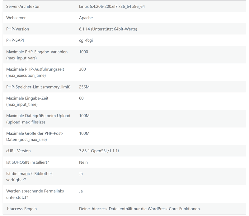 Dem Server-Bericht können Sie entnehmen, welcher Webserver verwendet wird (Apache), welche PHP-Version eingerichtet ist (8.1) und wie groß das PHP Memory Limit ist (256 MB). Allerdings handelt es sich bei diesen Angaben wie gesagt nur um die Standard-Einstellungen: Sie hängen davon ab, welchen Tarif Sie gewählt haben und welche Einstellungen Sie manuell vornehmen.