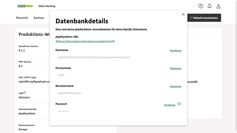In den WordPress-Einstellungen im DomainFactory-Kundenbereich können Sie unter „Datenbankdetails“ via phpMyAdmin direkt auf Ihre Datenbank zugreifen. Leider ist in allen WordPress-Tarifen nur eine Datenbank pro Seite integriert und es ist nicht möglich, schnell eine weitere Datenbank anzulegen.