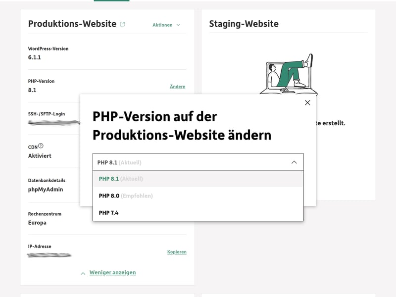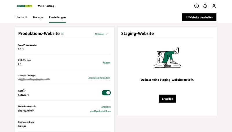 Staging-Umgebung: In den WordPress-Einstellungen können Sie mit nur einem Klick eine Staging-Umgebung einrichten, mit der Sie Ihre Website offline bearbeiten und Änderungen stressfrei testen können, ehe Sie die Version online stellen.