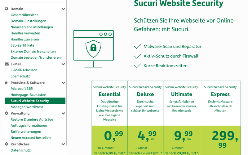 Eine Firewall und weitere Extra-Sicherheits-Features gibt es nur mit der kostenpflichtigen Erweiterung Sucuri.