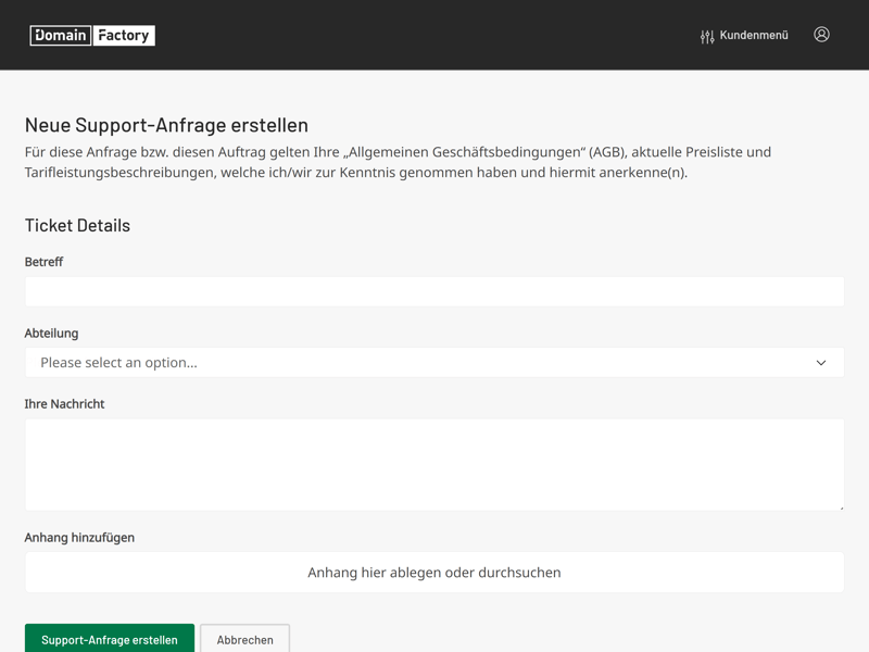 Direkten Support gibt es telefonisch oder per E-Mail/ Ticket. Einen Live-Chat bietet DomainFactory leider nicht an.
