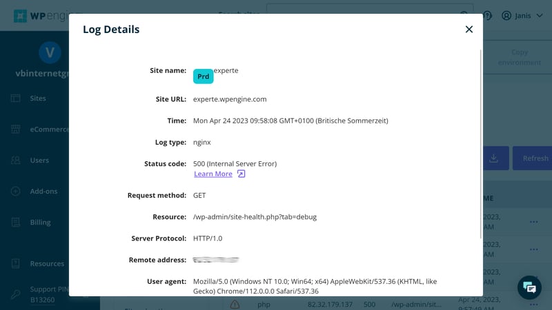 Für Sichtbarkeit sorgt WP Engine mit Nutzerrechten und Zugriffsprotokollen: Sie können genau festlegen, welche Nutzer auf welche Bereiche Zugriff erhalten und unter „Access Logs“ die Aktivitäten auf Ihrer WordPress-Seite einsehen