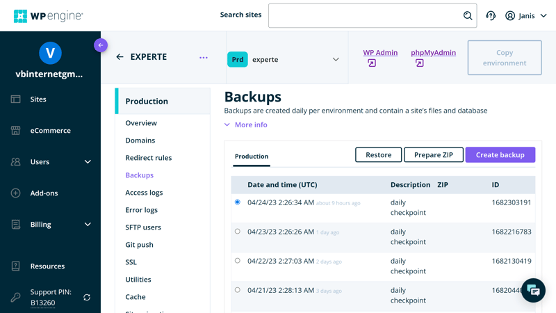 Backup-Funktionen von WP Engine