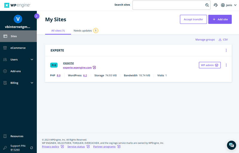 Nach der Installation finden Sie Ihre neue WordPress-Seite unter „My Sites“ im WP Engine-Kundenportal gelistet. Hier findet man sich schnell zurecht: Im Hauptmenü links navigieren Sie zu den übergeordneten Bereichen wie Ihren Websites, E-Commerce-Projekten, der Benutzerverwaltung, Add-ons und Rechnungen.
