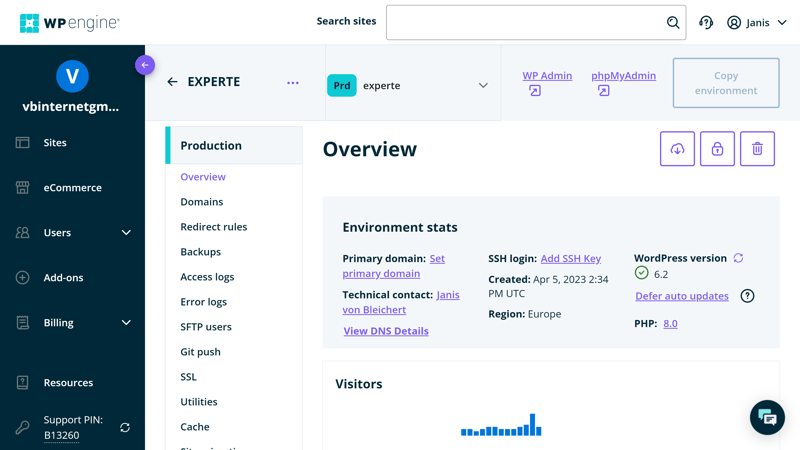 Der Admin-Bereich von WP Engine ist logisch aufgebaut.