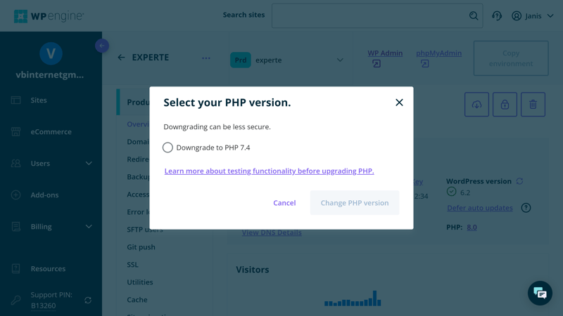 Beim PHP-Standard hinkt WP Engine leider ein wenig hinterher. Standardmäßig ist PHP 8.0 aktiviert und beim Versuch, die PHP-Version zu wechseln, stellen wir fest, dass nur ein Downgrade zu 7.4 möglich ist. Bei anderen Anbietern war die neuere Version 8.1 zum Testzeitpunkt längst Standard, manche unterstützten sogar 8.2.