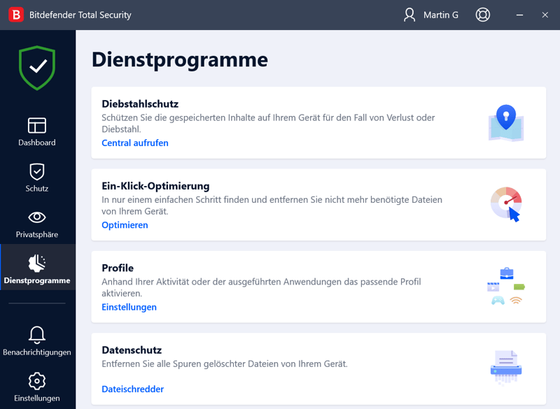Im Bereich „Privatsphäre“ befinden sich Ihre Datenschutz-Features, zu denen auch ein Passwort-Manager zählt. Bei den Bitdefender-Dienstprogrammen handelt es sich um Optimierungs-Tools und Diebstahlschutz.