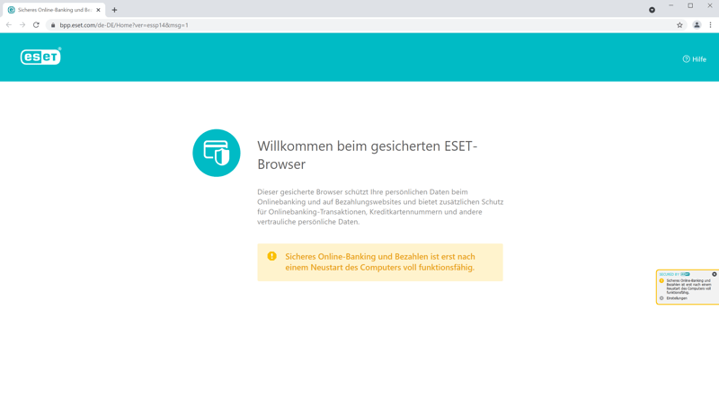 Andere Funktionen werden erst ab dem Internet Security-Tarif freigeschaltet. Dazu zählt sicheres Banking und Bezahlen mit dem integrierten ESET-Browser, der persönliche Daten beim Onlinebanking und Transaktionen im Netz besser schützt als herkömmliche Browser.