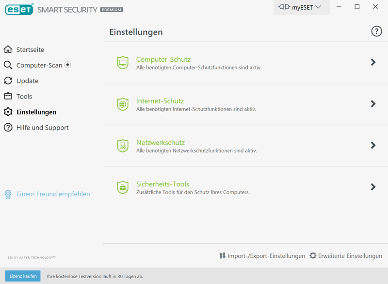 Sie können ESET Smart Security Premium 30 Tage lang kostenlos testen – ohne die Angabe von Zahlungsdaten. Zudem gibt es eine 30-tägige Geld-zurück-Garantie.
