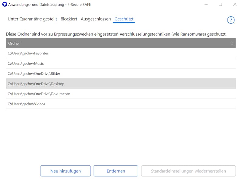 Auch vor Ransomware, den sogenannten Erpressungstrojanern, die Ihre Dateien in Geiselhaft nehmen und nur gegen Lösegeld wieder freigeben, beschützt Sie F-Secure. Allerdings werden nur ausgewählte Ordner auf diese Weise geschützt. Jene können Sie in der Anwendungs- und Dateisteuerung festlegen.