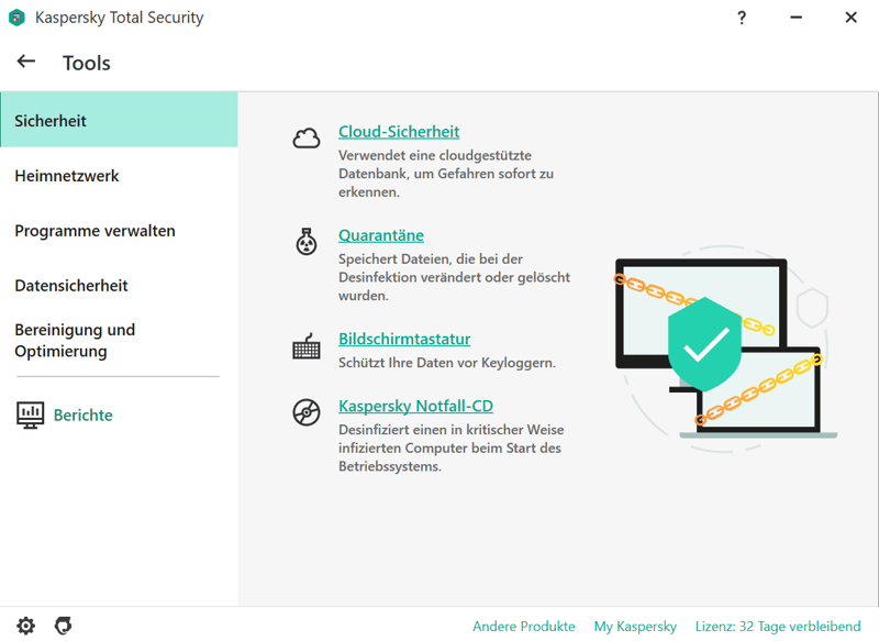 Sie können die Kaspersky-Tarife 31 Tage lang kostenlos in vollem Funktionsumfang testen. Es gibt eine 14-tägige Geld-zurück-Garantie.