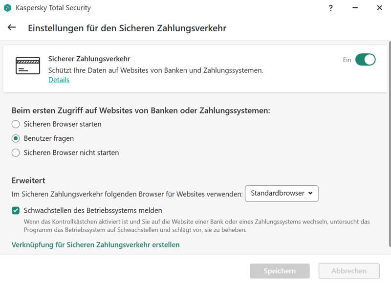 Ebenfalls ab dem Internet Security-Tarif gibt es ein Feature für sicheren Zahlungsverkehr. Kaspersky besitzt einen integrierten Sicherheits-Browser, der sich bei von Ihnen angegebenen Websites automatisch öffnet und sichere Zahlungsvorgänge garantiert. Sie können die URLs entweder manuell hinzufügen oder die automatische Erkennung von Kaspersky nutzen.