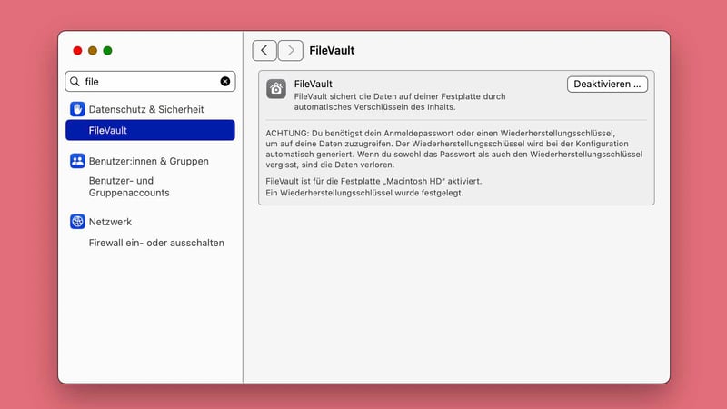FileVault verschlüsselt die interne Festplatte – und zwar vollständig. Der Schutz greift vor allem bei physischem Zugriff, also etwa bei Diebstahl oder wenn das Gerät verloren geht. Ohne das Passwort bleiben die gespeicherten Daten unzugänglich.Sandboxing und Berechtigungen