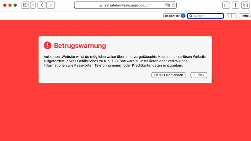 Safari erkennt betrügerische Webseiten automatisch. Die Warnung soll vor Phishing und Datendiebstahl schützen.