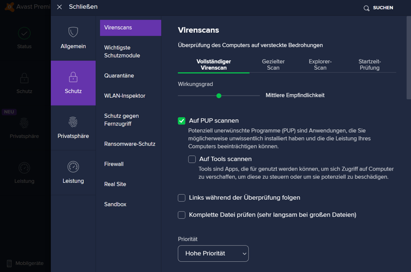 Avast bietet Nutzern detaillierte Einstellungsmöglichkeiten