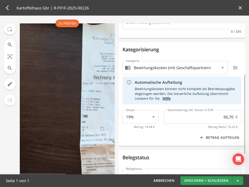 Die meisten Tools bieten dafür spezielle Funktionen an. Bei Lexware Office wird die steuerliche Aufteilung etwa automatisch vorgenommen, wenn Sie einen Beleg als „Bewirtungskosten“ kategorisieren.