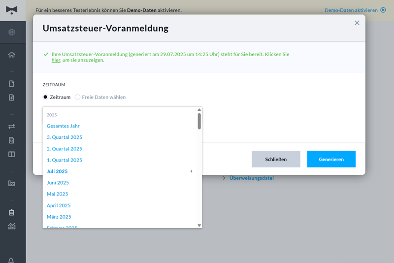 Noch einfacher geht es mit einer Buchhaltungssoftware: Weil Sie dort alle Einnahmen, Ausgaben und Belege ohnehin erfassen, kann die UStVA basierend auf diesen Daten automatisch ausgefüllt und per ELSTER-Schnittstelle direkt ans Finanzamt übermittelt werden.