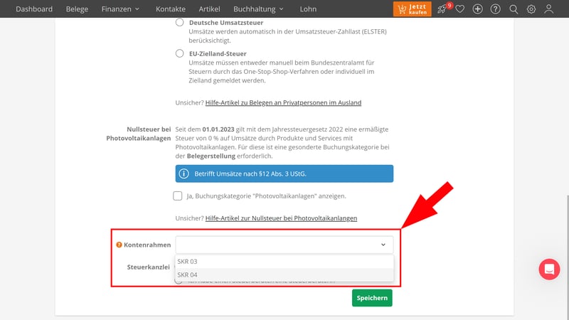 Gängige Kontenrahmen sind in den meisten Programmen bereits hinterlegt. Bei unserem Testsieger Lexware Office können Sie etwa in den Einstellungen auswählen, ob SKR 03 oder SKR 04 verwendet werden soll: