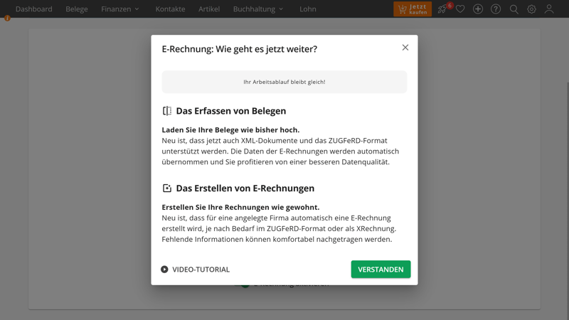 XRechnungen werden bereits länger unterstützt, ZUGFeRD-Rechnungen sind mittlerweile auch dabei. Die Erfassung von E-Rechnungen ist dabei in allen Tarifen möglich, der Versand erst ab dem M-Tarif.