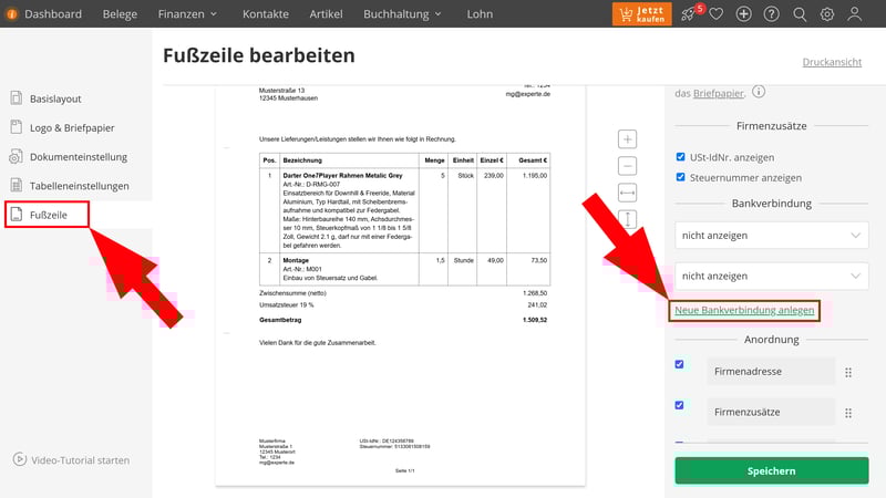Schritt 4: Dann ist noch wichtig, dass in der Rechnung, die Sie verwenden, eine Bankverbindung angegeben ist. Dafür öffnen Sie die Rechnungsvorlage, navigieren zum Eintrag „Fußzeile“ und klicken rechts unter „Bankverbindung“ auf „Neue Bankverbindung anlegen“.