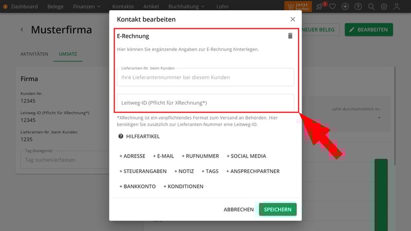 Schritt 3: Wenn Sie eine XRechnung an einen öffentlichen Empfänger senden, muss eine Leitweg-ID hinterlegt sein. Dabei handelt es sich um eine eindeutige Kennung, die zur Weiterleitung der Rechnung innerhalb der Behörde dient. Sie können sie in den Kontakteinstellungen hinzufügen.