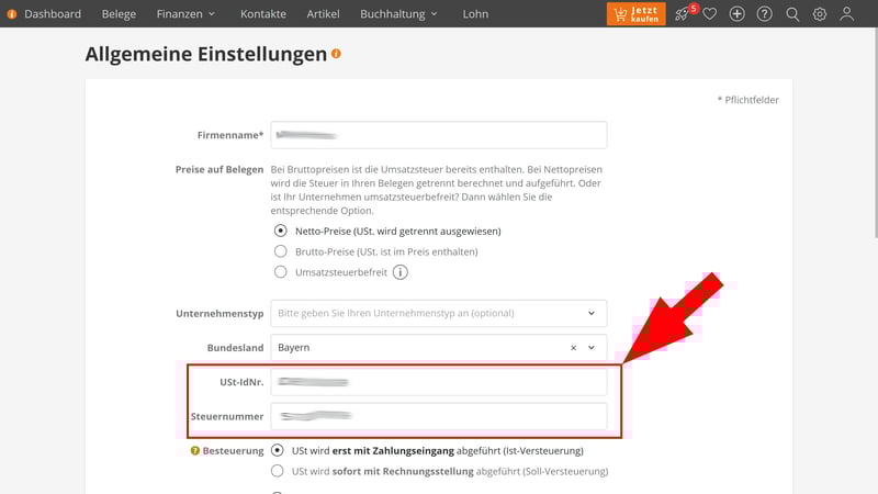 Schritt 2: Damit Lexware Office vollständige E-Rechnungen erstellen kann, sind einige Angaben erforderlich. Zunächst ist wichtig, dass in den „Allgemeinen Einstellungen“ Ihre Steuernummer und Umsatzsteuer-ID hinterlegt sind: