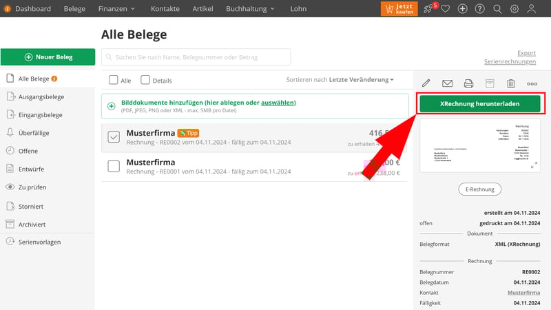 Laden Sie Ihre E-Rechnung in der Belegerfassung hoch.