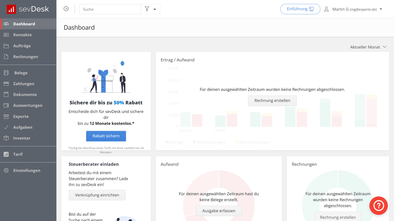 Im aufgeräumten sevdesk-Dashboard können Sie blitzschnell Dokumente wie Rechnungen und Angebote erstellen und Ihre Unternehmensfinanzen übersichtlich im Blick behalten.